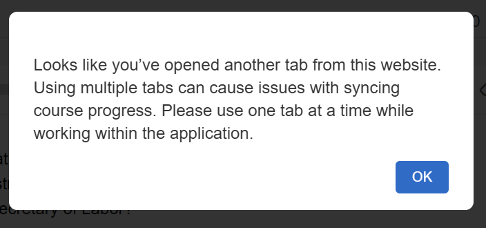 If your course is open on multiple tabs in your browser, a warning message will pop-up on each tab. We recommend having your course open on only one tab at a time in order to prevent any syncing issues. To close the modal, click Ok. This will not log you out or close the current tab.