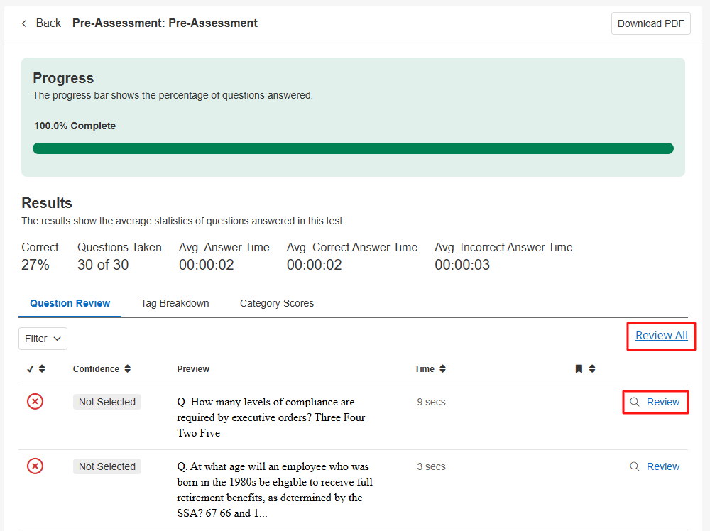 3. To review each question one-by-one: If an exam has multiple sections you can 1. Click "Review All" to review all questions in the exam (all sections). If the test does not have multiple sections or you want to review only a specific section then you can 2. Click “Review” next to the specific section you'd wish to review.