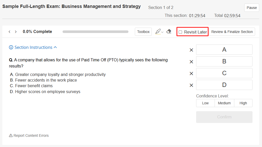1. During the exam, a box labeled "Revisit Later" will appear above the answer options. Check this box to pin the question for further review.