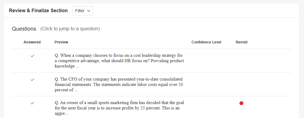 2. When you review your answers before submitting them, a red marker will appear under the Revisit column to remind you to look over the question. Checking the box for "Revisit Later" will automatically bookmark the question upon submitting an exam.