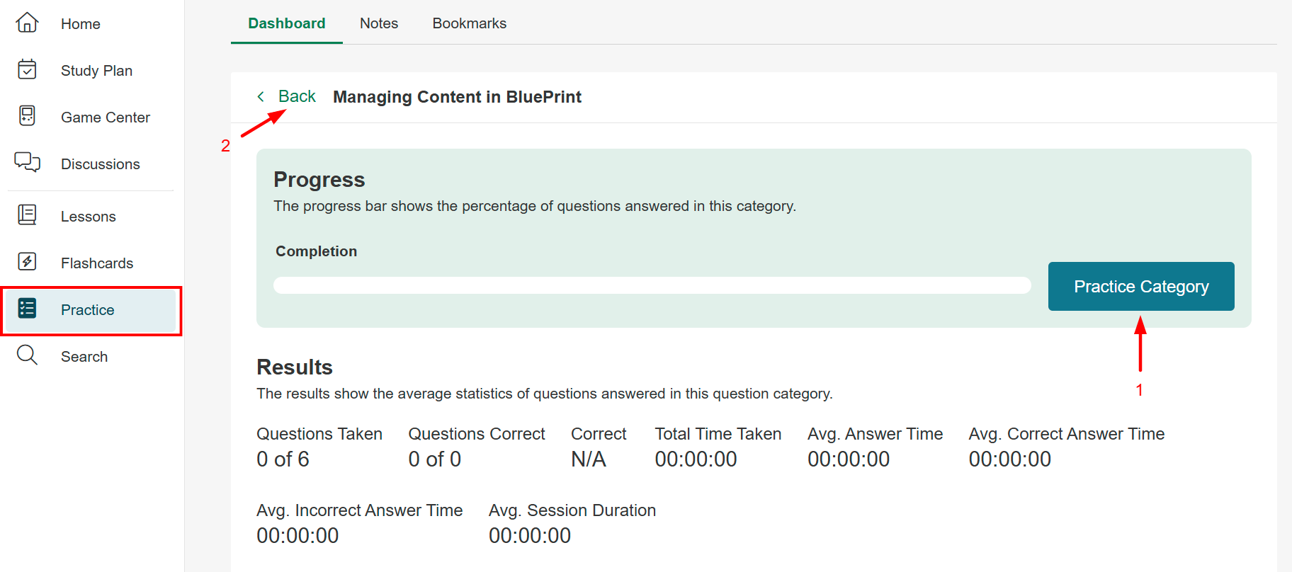 - If you find yourself in the Practice Category Screen and wish to navigate back to your report, then click on the Back button from within the page. This feature allows you to navigate from within the screen without having to use the back button on your browser.