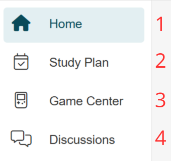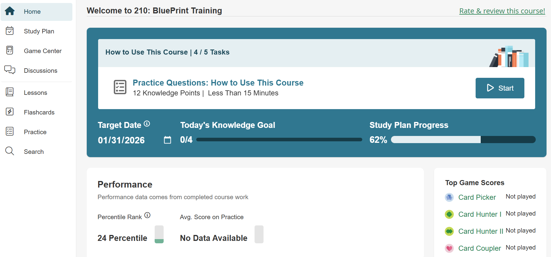 - Home: On the home section, the learner is able to see a high level overview of their course progress. Here, you can easily get a glimpse of your strengths and weaknesses, a brief overview of the Game Center, achievements, and a calendar that allows you to set a goal end date. You'll also see your Percentile Rank, Avg. Score on Practice, Avg. Score on Tests, and Avg. Score on Interactions (if the course includes them).