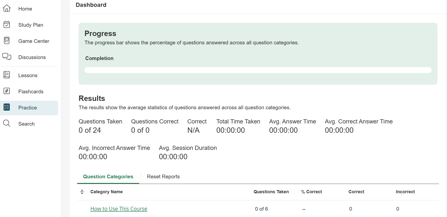 - Practice: The Practice tab shows the total number of practice questions you have answered in this course, the average amount of time it takes to answer a question, the average amount of time it takes to answer a question incorrectly, the average time it takes to answer a question correctly, and average practice session duration. It also shows your performance within each practice category and subcategory, including their overall score, number of correct answers, and the total number of questions in each category.