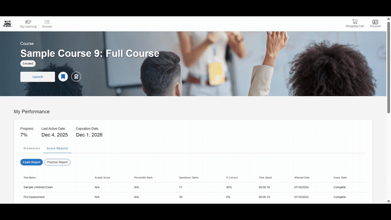 - Exam Report - appears when "Previous Exam Score Reports" feature access is on. It provides a detailed view of reset exam activity, showing information such as exam name, questions taken, percent correct, time spent, attempt date, and exam state. For exams that support scaled scoring, the report also includes your scaled score and percentile rank.