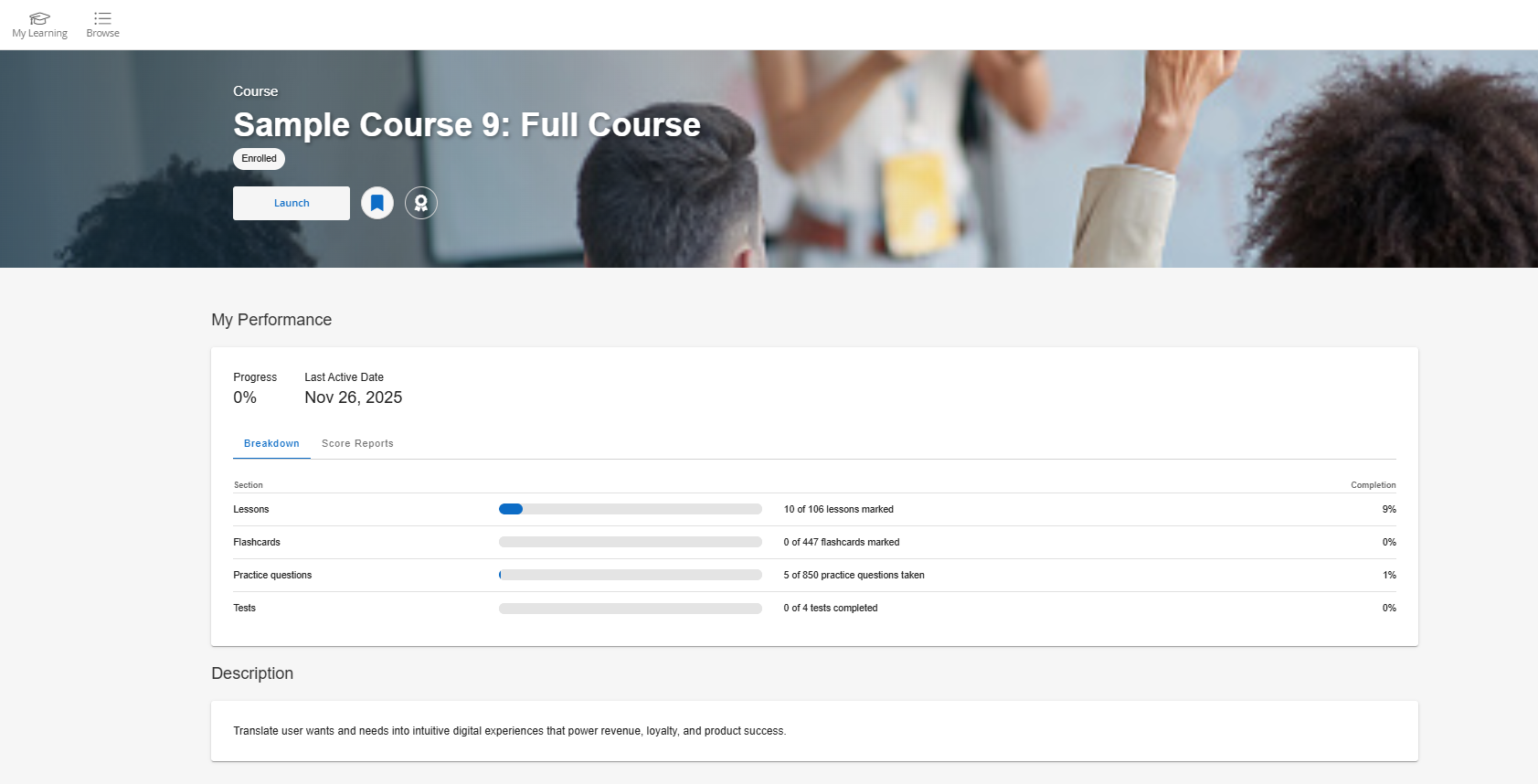 When the learner clicks on View Details, the summary page will populate the description field and display the learner's association to that course (i.e. enrolled, study, launch, or buy).