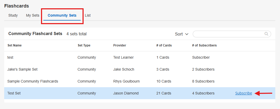 The Community Sets tab displays all Community sets created for this course. Hover over each set to subscribe/unsubscribe from a set.