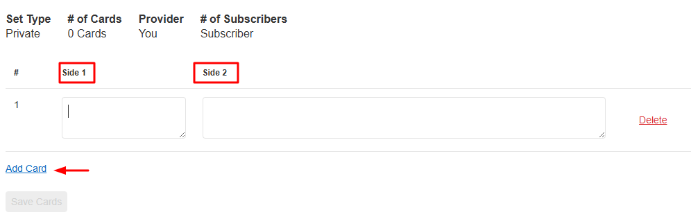 - On the Flashcards page, fill out the information for Side 1 and Side 2.