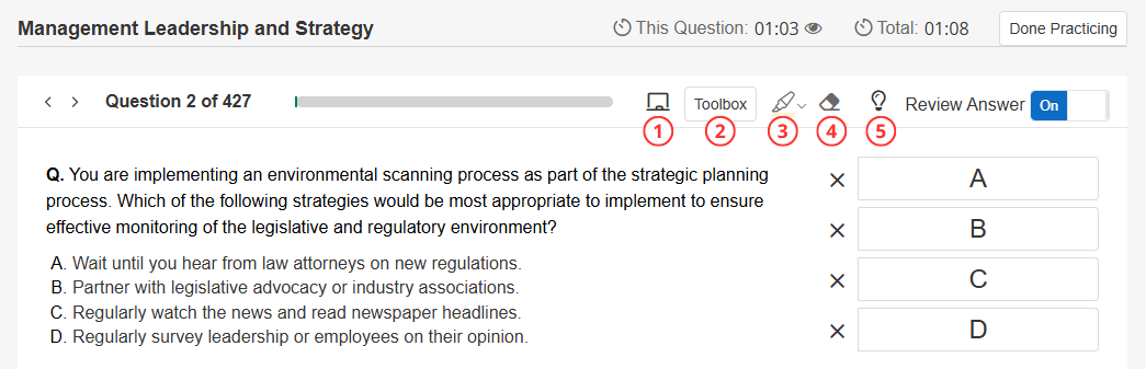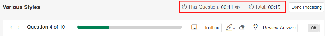 To learn more about these tools, check out the section below on Practice Question Tools.