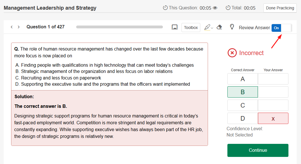 - Toggle OFF if you’d like to practice questions without reviewing your answers. You will still be able to review them after your session is complete.