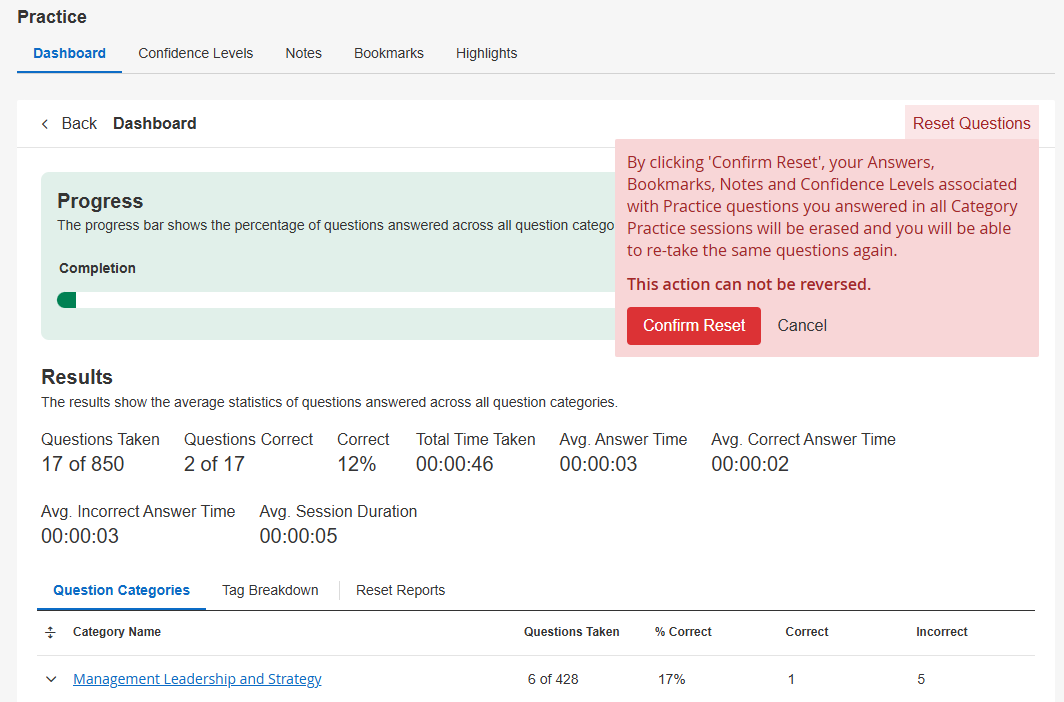 If you’d like to reset all of the practice questions you’ve completed, navigate to the Practice Dashboard and click on Reset Questions near the top-right. Review the confirmation modal and select Confirm Reset to proceed.