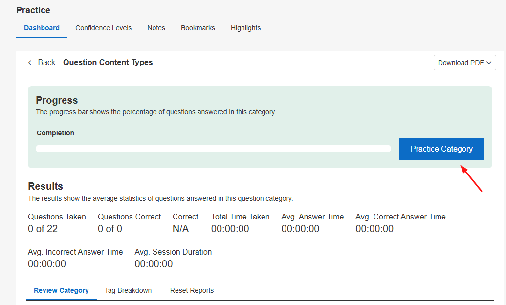 On the Practice Dashboard, you’ll be able to see all question categories for your course. The dashboard will display your current progress, average score, how many questions you’ve taken so far, and average practice question times (answer time, correct answer time, incorrect answer time, and session duration).