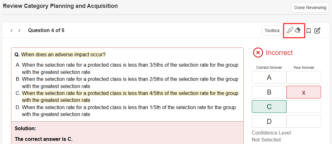 When taking or reviewing your practice questions, there are several tools you can use including Highlights, Bookmarks, Notes, and more. Some tools will need to have a feature access enabled in order to use them. More information about practice question feature accesses and how to configure them can be found in our article here.