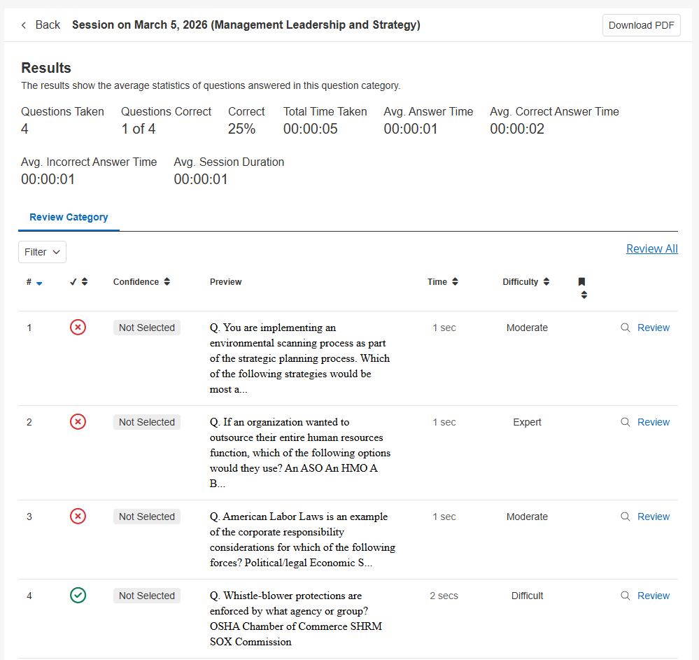 This section provides directions on downloading a pdf version of category practice questions and previously completed questions. In order to download Category Practice questions or previously completed questions the feature access Enable download of questions PDF in Webapp must be enabled. This feature access is managed by BenchPrep and can only be enabled by BenchPrep admins. To learn more about this feature access click here.