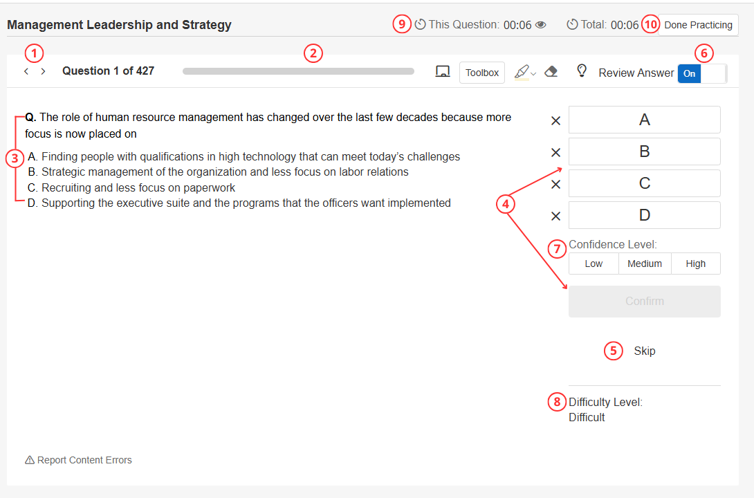 NOTE: The Confidence Level Marking During Practice Questions is Required or Optional feature access will need to be enabled. - Difficulty level