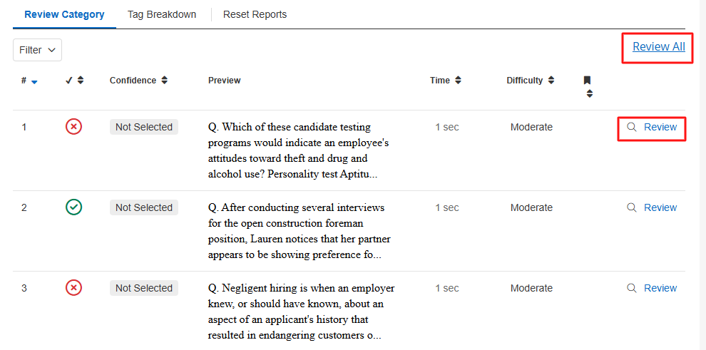 To preview a question click the magnifying glass icon. Click Review to see a singular question and answer. Click on Review All or Review Category (if the category has been completed) to review all your questions and answers.
