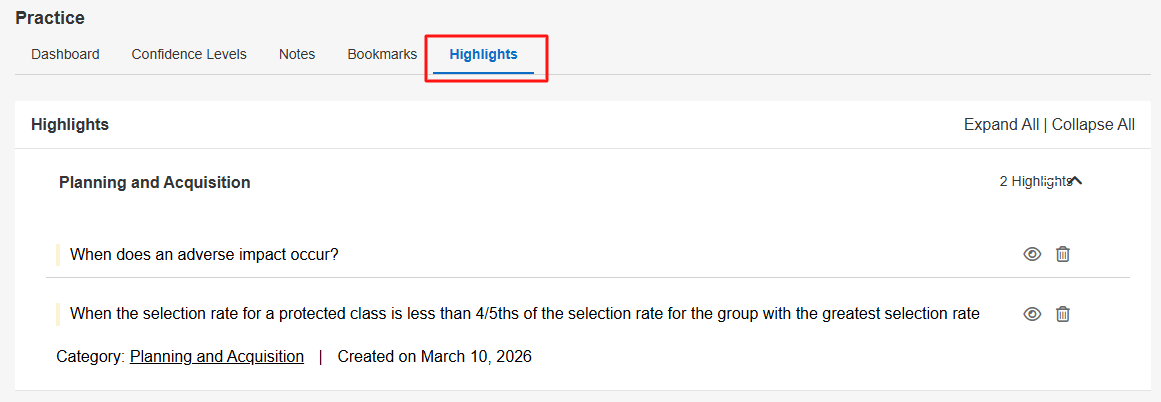To view all of your question highlights, click on the Highlights tab at the top of the Practice Dashboard. Click on a question category to expand it, or click on Expand All at the top-right to see what content you've highlighted within your questions. Click on the eye icon next to a highlight to preview the question, or click on the trashcan icon to delete the highlight.