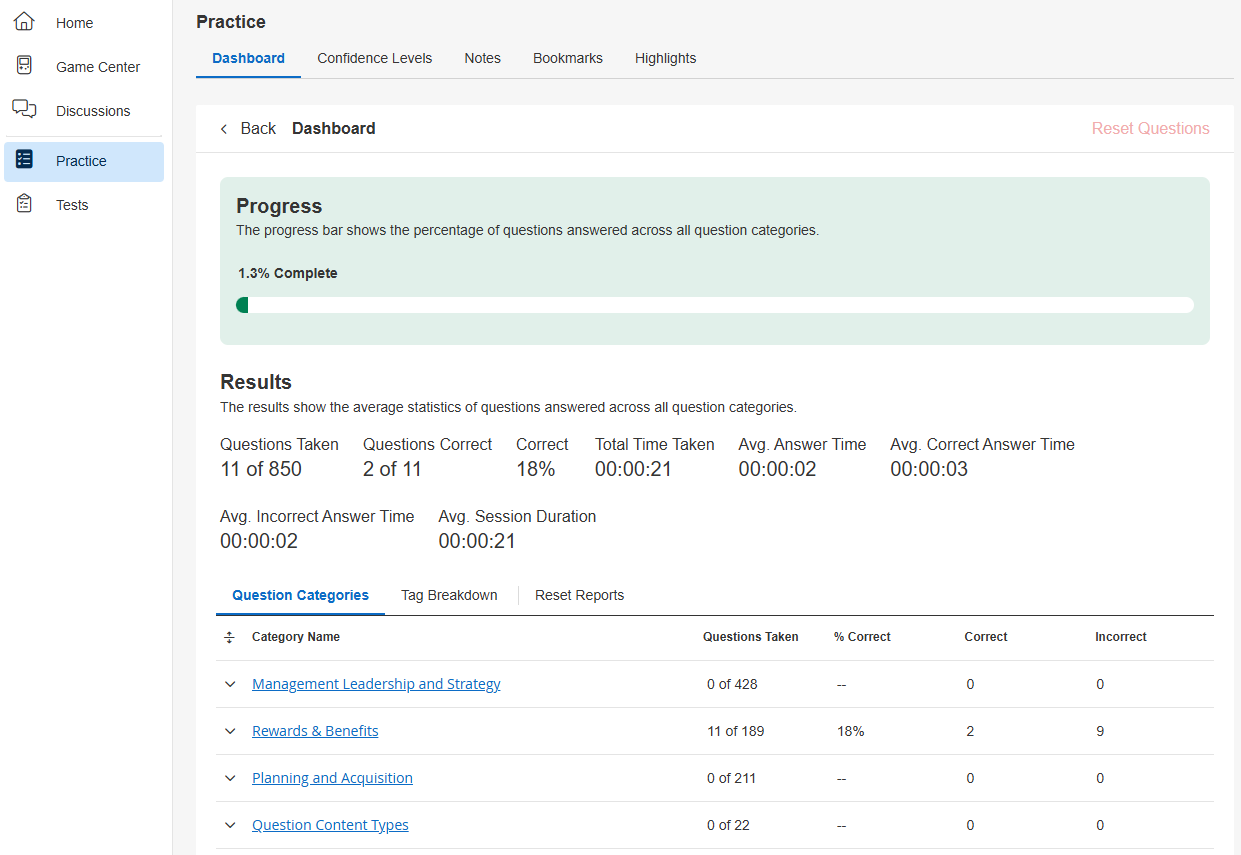 If you’d like to reset practice questions you’ve completed for a specific category, navigate to the Practice Dashboard and click on the category you want to reset. Then click on Reset Questions. Review the confirmation modal and select Confirm Reset to proceed.