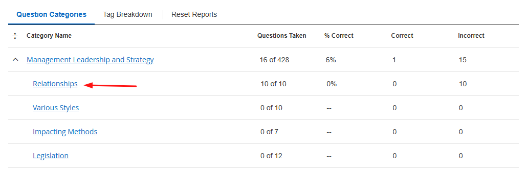 The question categories included in your course will be listed below and will display each category’s name, percentage complete, and percentage correct. Sub-categories are indented below their parent category.