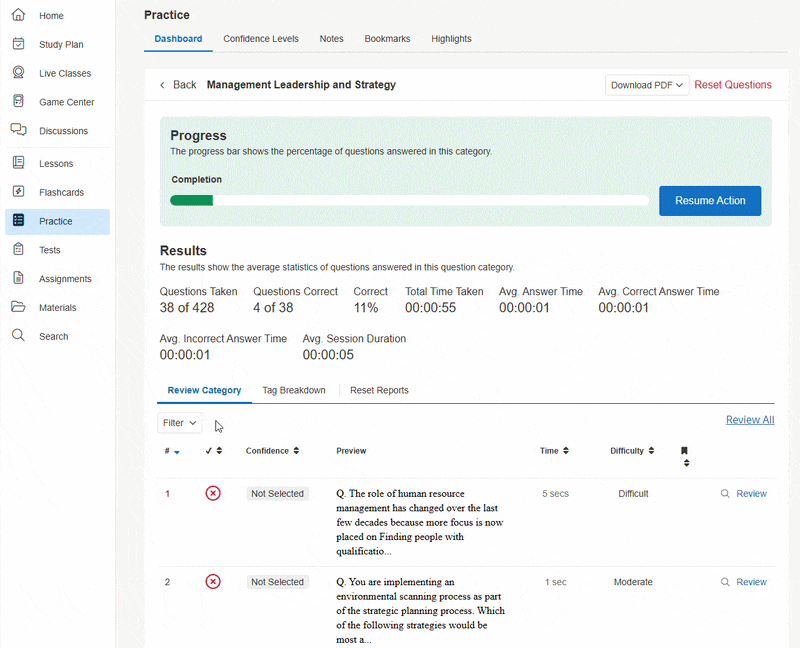 Practice questions can be accessed through either the Study Plan or Practice tab on the left-hand navigation bar of your course. In the Practice section, you’ll be able to track your progress for all question categories, begin a new practice session, and review answers for your completed questions.