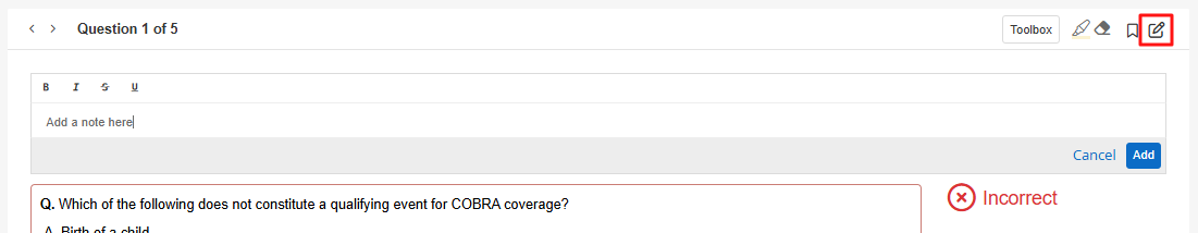 To leave a Note when reviewing your answers, select the Note icon at the top-right. Type your note into the dialogue box, and then click on Add.