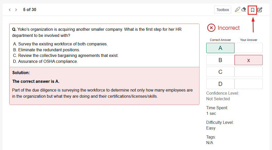 The Bookmark Tool will add the current question to your Bookmarks list, which is accessible from the top toolbar in the Practice Dashboard. Click the bookmark icon while reviewing your answers if you want to save a question to return to later.