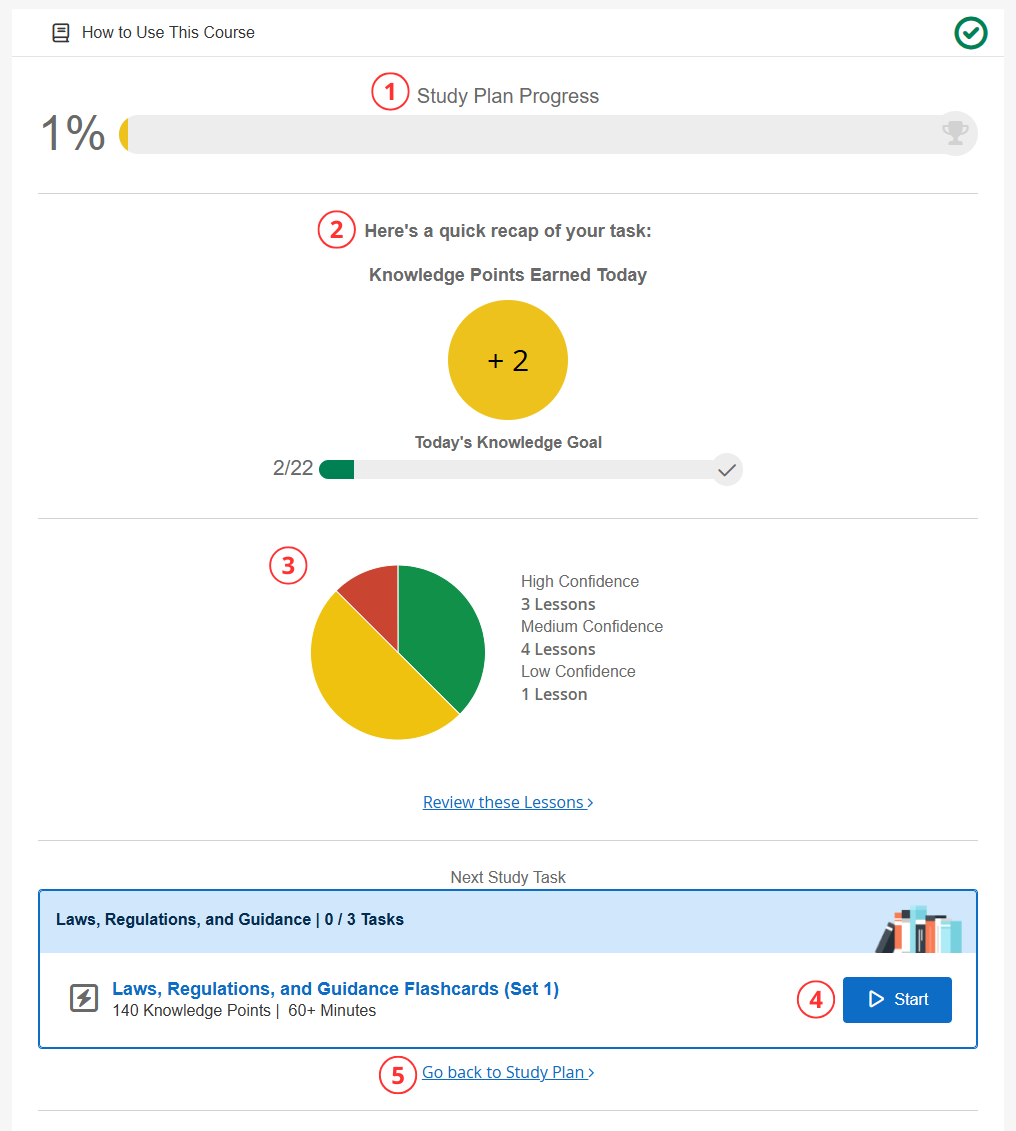 Review these Lessons - Ability to go back and review what you just learned- NOTE: The "Complete" Confidence Level will only appear if the study task has one or more lessons that are set to hide confidence levels. If the feature access "Hide Confidence Levels on All Lessons" is ON for the course, the whole section will not appear.