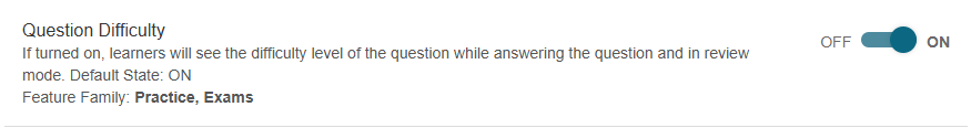 The Question Difficulty feature is enabled at a course level by default. Reach out to BenchPrep if you would like to toggle the feature access OFF.