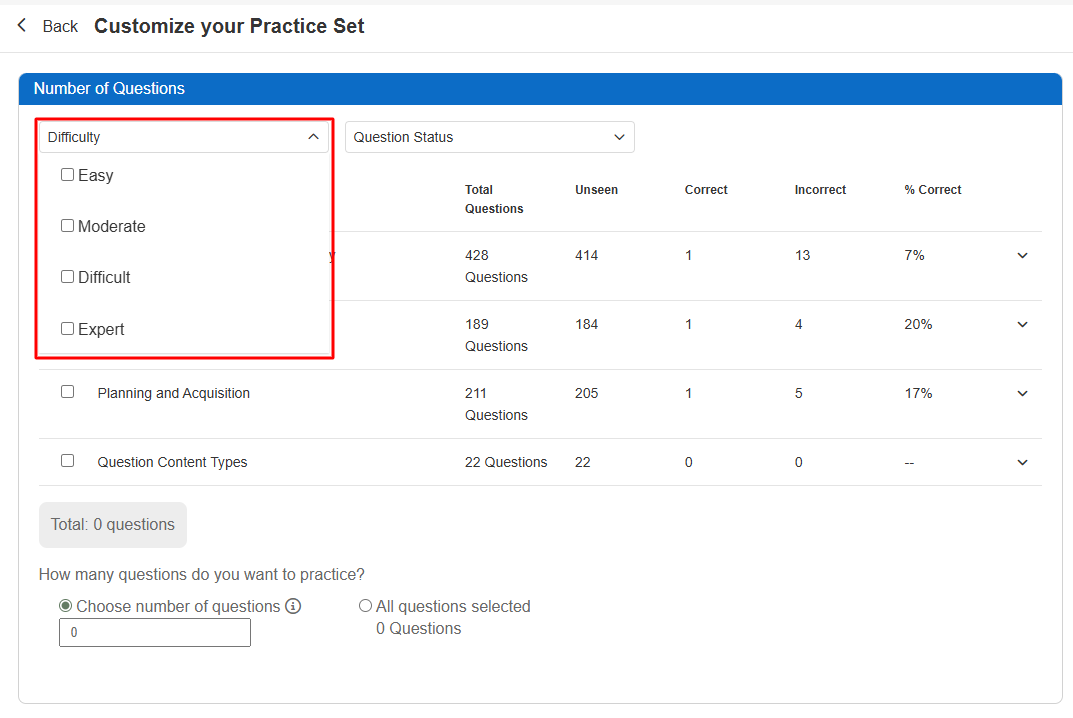 Enabling this feature allows learners to add questions to their custom practice session based on difficulty. As learners attempt practice questions, the BenchPrep platform uses their data to assign each question one of four difficulty ratings: “Easy,” “Moderate,” “Difficult,” or “Expert.” These difficulty ratings can change over time based on learner data.