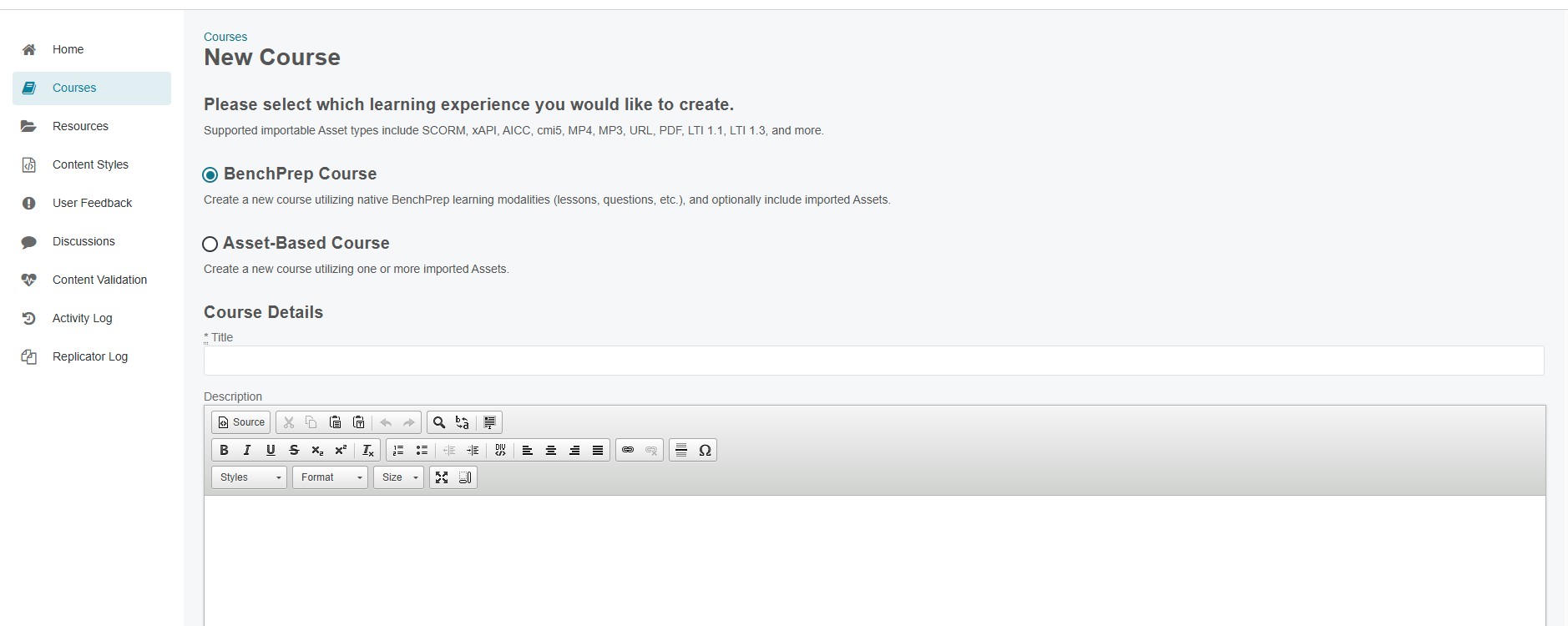 BenchPrep course content can be manually created or imported in through our import tool You can also replicate course content from an existing course. To learn more about replication, click here. BenchPrep courses give you the flexibility to create flashcards, questions, assignments, practice tests, and upload assets within BluePrint. Remember, unlike Asset-Based courses, you cannot create your content within a course authoring tool and import. All content is created within the BluePrint application.