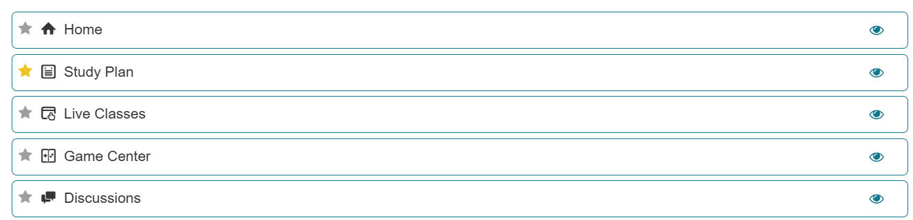 NOTE: If an item is grayed out and has no option to show/hide, then it’s been disabled and needs to be turned on via Course Configuration in order to use it for your course.