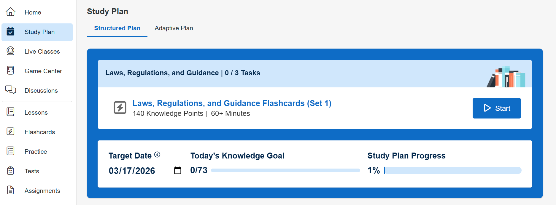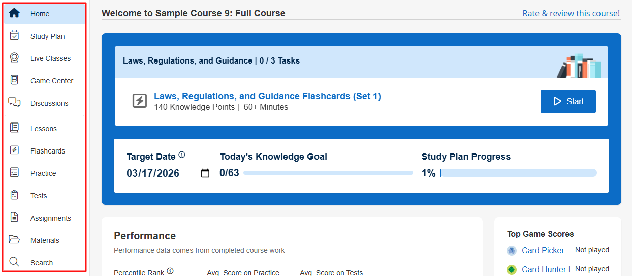NOTE: If there is no content within a modality in BluePrint that is indicated as the course’s landing page, the landing page will default to Home. When Practice is selected as a learning modality, the course landing page will change based on which practice options are enabled: