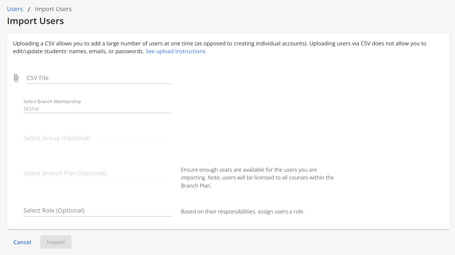 Using the Import Branch Members option allows you to import NEW users and assign them as Branch Members to a specific branch. Bulk importing users does not allow you to edit/update user names, emails, or passwords for accounts that already exist. These will be skipped during the import process.