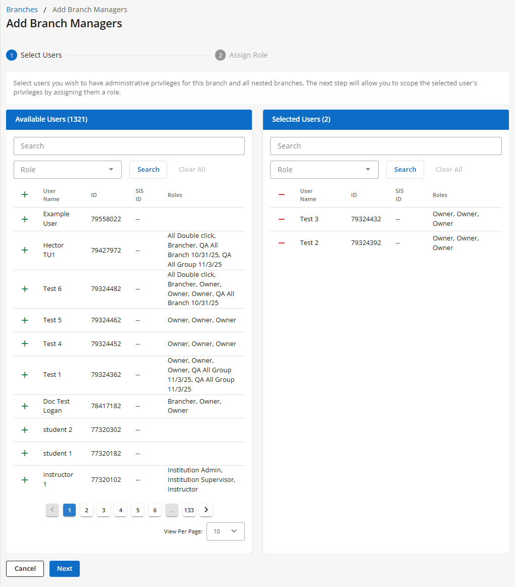 - Move any users you want to be branch managers from the Available Users table to the Selected Users table by selecting the + icon next to their name(s), then select the Next button.