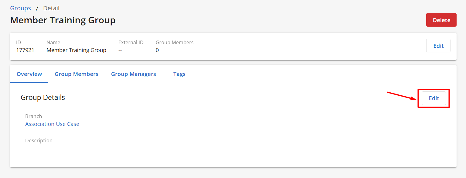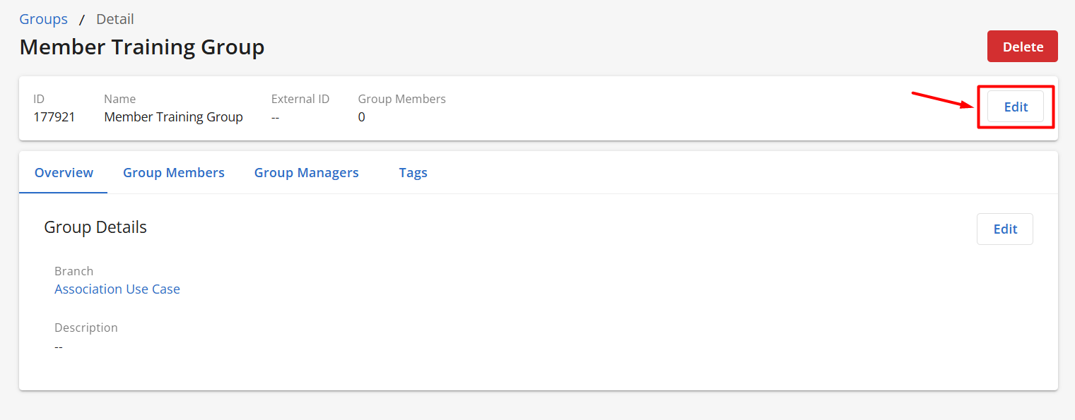 NOTE: If your group has an External System ID setup, this field will also appear on the group's details page and can be edited via the pop-up modal. - To edit the description of the group, select the Edit button in the Overview tab. Edit the information in the pop-up, then select Save.