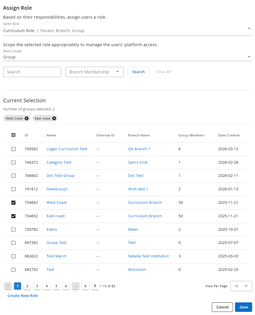 - Assign a role (optional) for your users, select the role’s scope (i.e. tenant, branch), and click Save. If you select a group or branch-scoped role, you can choose one or more groups/branches from the multi-select list by clicking the appropriate checkboxes. The role will be scoped to the selected groups/branches for all imported users.