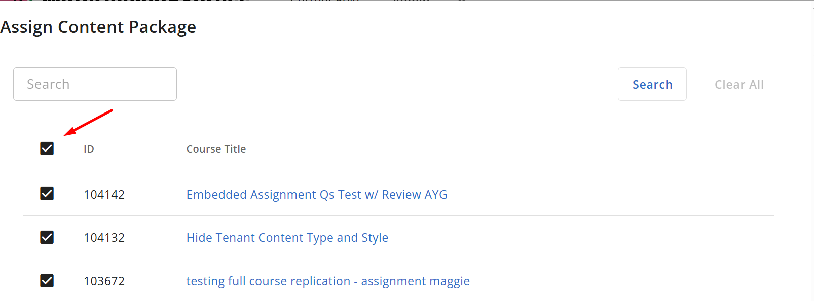 NOTE: The “Select All” checkbox only applies to the courses displayed on the current page. If your tenant has multiple pages of Content Packages, navigate to each page and select the courses on that page individually, or use “Select All” again on each page to include all desired Content Packages.