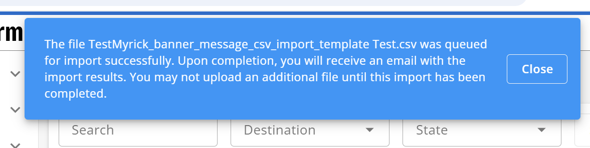 A notification banner will let you know that the file is processed. Upon successful completion you will receive an email notification informing you the process completed.