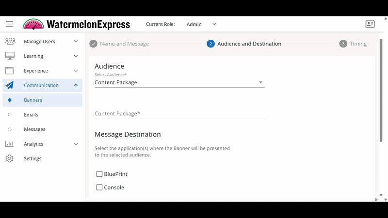 - Select your Audience (who will see your banner). It can be set to specific content packages, Learning Hub Event, role, user(s), or for all users. To include multiple Content Packages, check the box next to each course you would like to select.