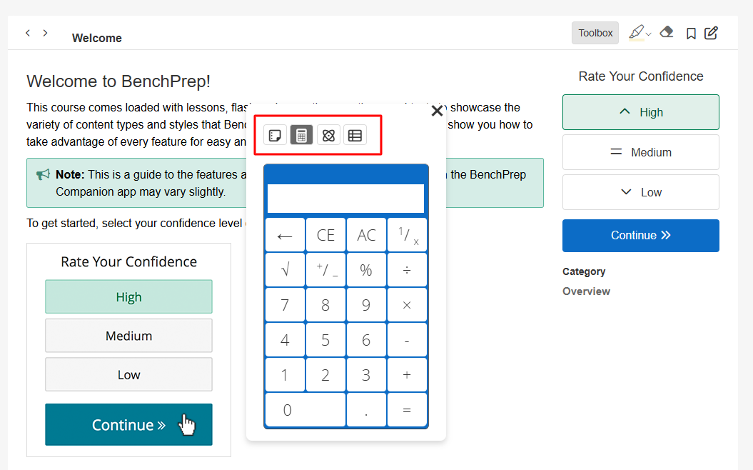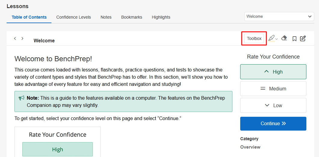 - Access a course in the learning application, and select either practice questions or lessons. (Note: the course must have the Toolbox feature enabled.)