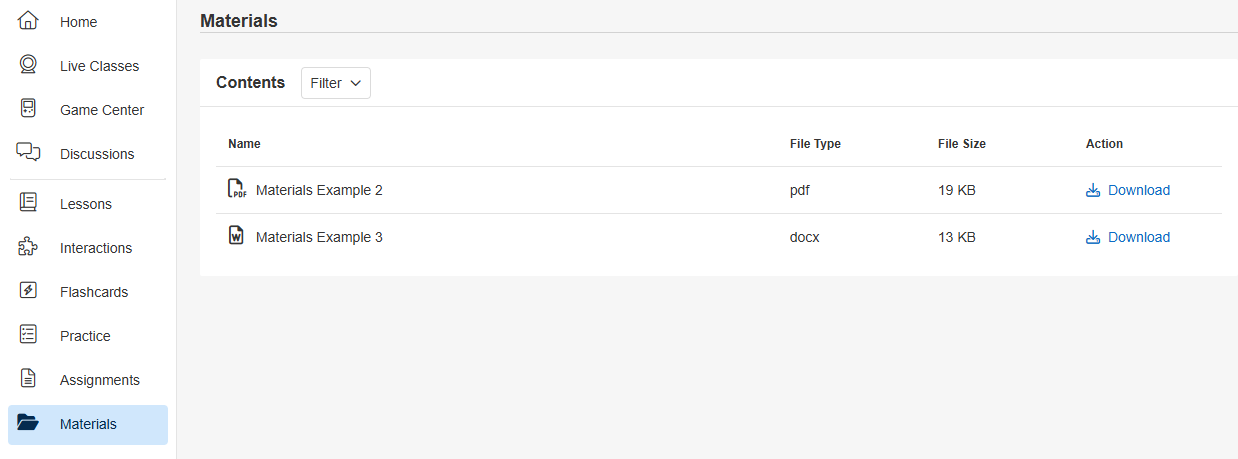 - This page shows all materials uploaded to this course, the type and file size of each material.