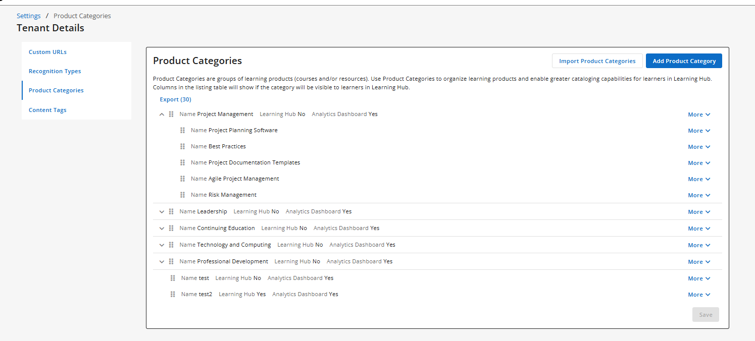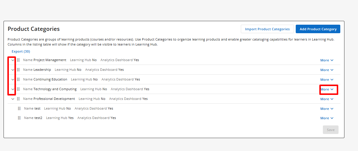 You can rearrange product categories by using dragging and dropping them. The order of the product categories will be reflected in Learning Hub and Learner Analytics (if enabled). When rearranging product categories keep in mind:
