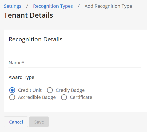 - Type in the name for your recognition, and select an Award Type. The type can be a Credit Unit, a Credly Badge, or an Accredible Badge.
