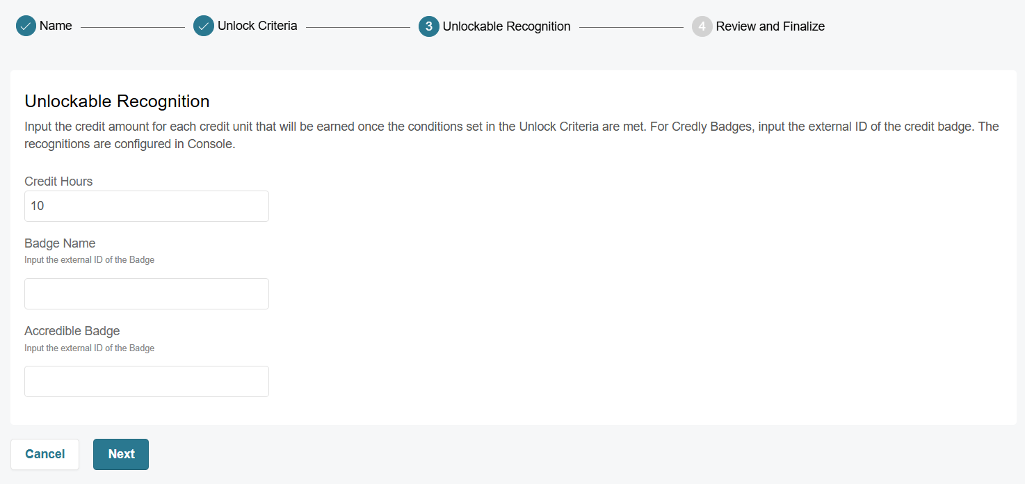 - For unlockable recognition, input your Credit Hours, the external ID of your Credly Badge, and/or the external ID of your Accredible Badge. The Credit Hours field will only accept a numerical value (including decimals), and any characters can be inputted in the fields for badges. Click on Next.