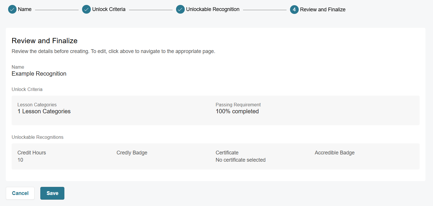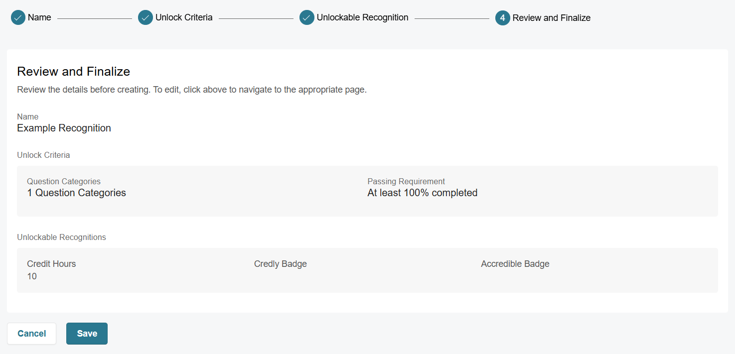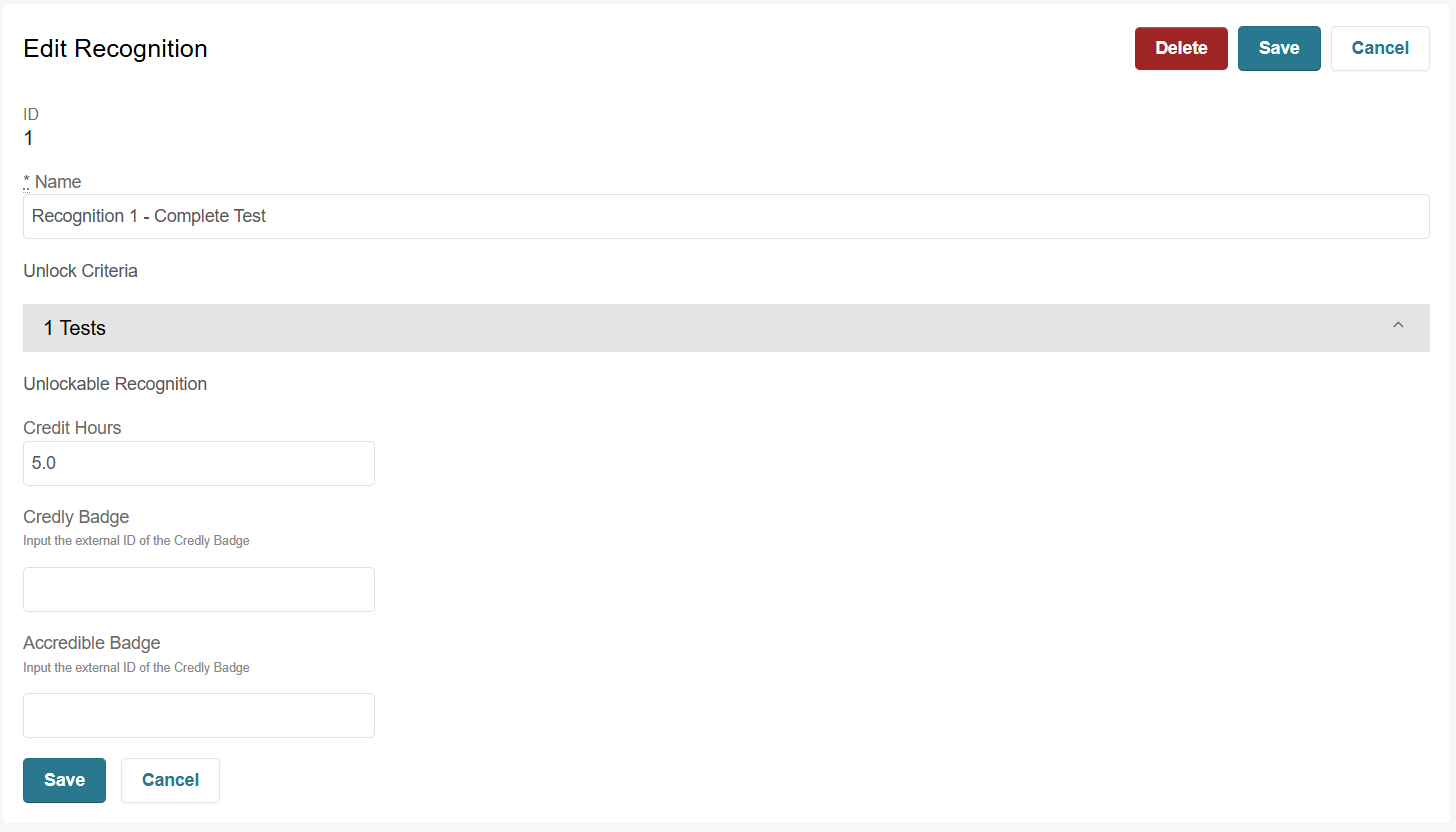 Creating a Recognition involves specifying the unlock criteria; what needs to be completed in order to earn the recognition and unlockable criteria; the credit amount for the credit unit that will be awarded after completing criteria specified in the unlock criteria section. For Credly and Accredible Badges, input the external ID of the badge that will be earned after completing criteria specified in the unlock criteria section.