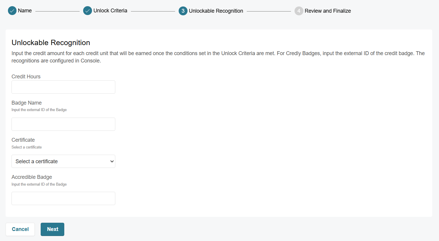 - For unlockable recognition, input your Credit Hours, the external ID of your Credly Badge, the external ID of your Accredible Badge, and/or select a certificate. The Credit Hours field will only accept a numerical value (including decimals), and any characters can be inputted in the fields for badges. Click on Next.