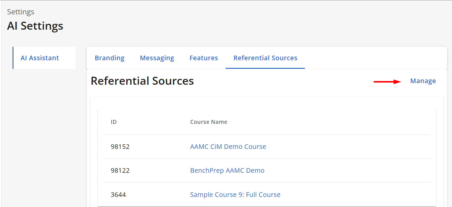 Course-level referential sources control which tenant-level courses the AI Assistant will use when responding within a specific course.