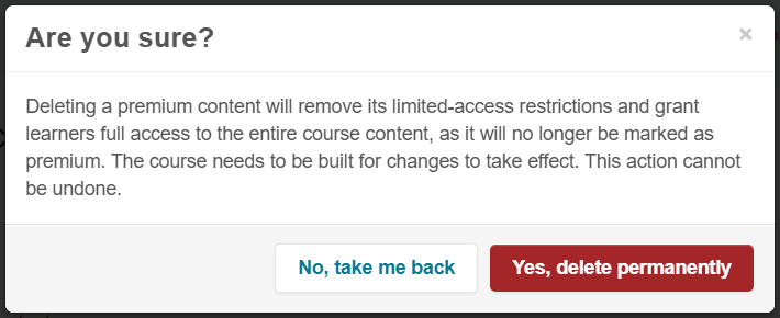 - Click on Yes, delete permanently to confirm. Once the Premium Content is deleted, all learners enrolled in the course will be able to access that content now.