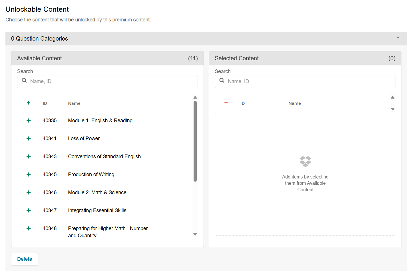 - Move content from the Available Content to the Selected Content section by clicking on the + icon next to an item.