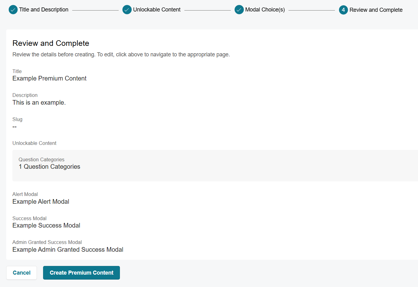 - Review your Premium Content details. If you need to edit anything, click on the appropriate section to navigate to that page.