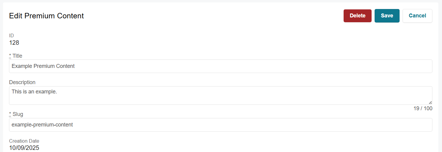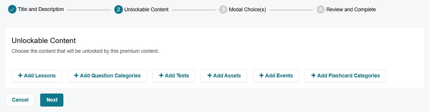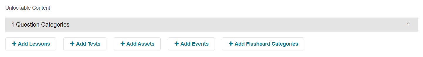 NOTE: If no slug is entered, it will automatically use what you have as the title. - Add the content that will be unlocked by this Premium Content. You can add lessons, question categories, tests, assets, events, or flashcard categories. More than one content type can be added.